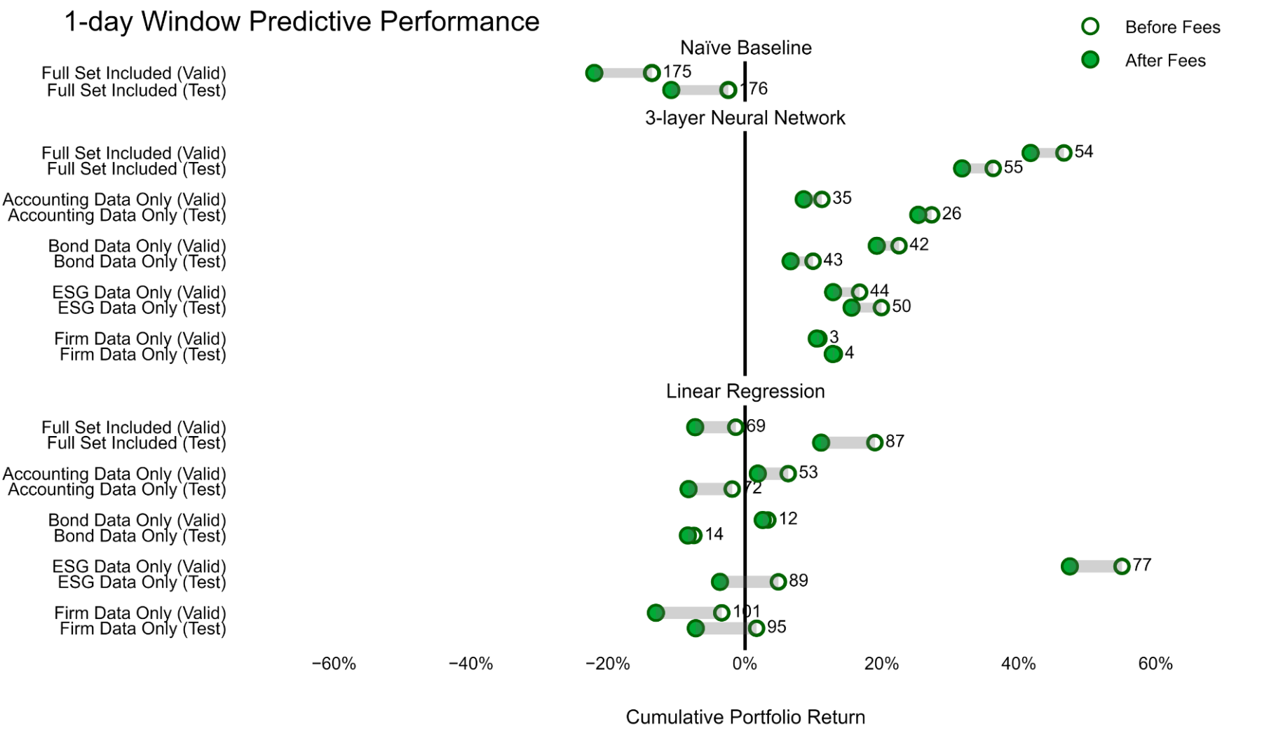 Two interesting findings came out of this research. First, investors, on average, viewed the issuance of green bonds favourably – first-time issuers tended to see a boost in stock prices. Secondly, and more importantly, we found that stock price anomalies were found to be predictable by Neural Networks, but not by more traditional means of examination (Linear Regressions). Our research provided further evidence that i) new financial instrument can introduce inefficiencies, and ii) deep learning techniques can have a place at the table in finance.